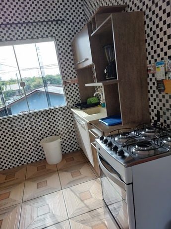 A cozinha bem equipada com todos os utensílios, fogão geladeira e armários.